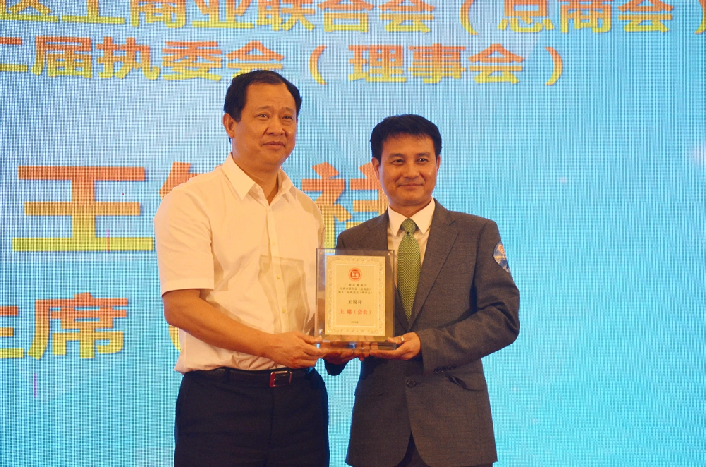 ▲番禺区委书记、区长何汝诚(左)为王锐祥(右)颁发工商联主席证书