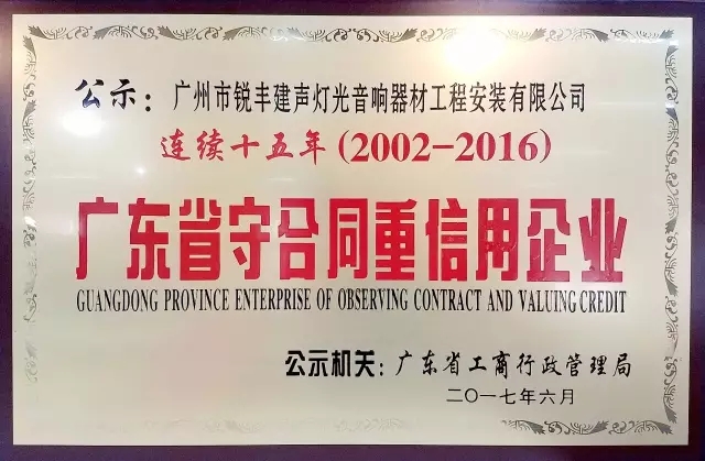 近日,锐丰获得了“广东省守合同重信用企业”的殊荣。这是继2002年开始连续十五年获得此殊荣。